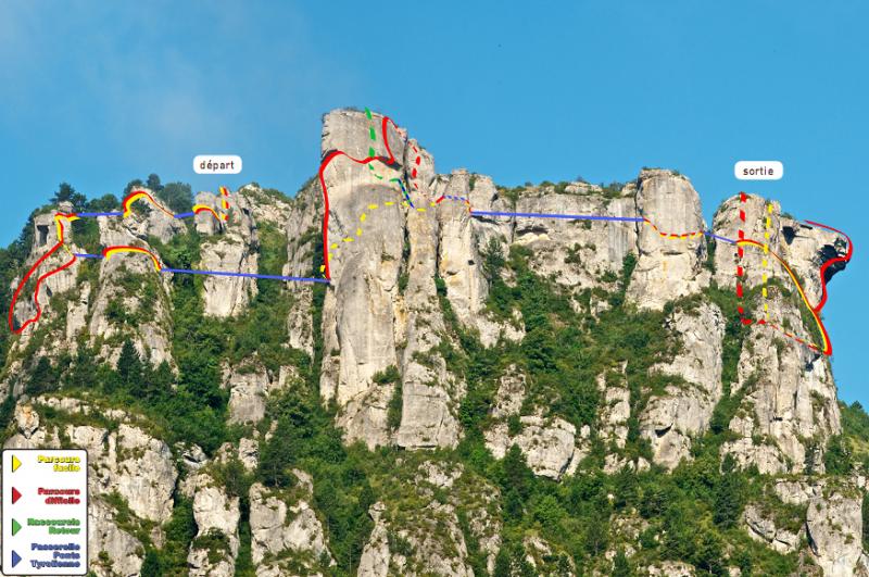 On entre dans la via ferrata du Rochefort par un passage étroit « le canyon ». Au bout de ce canyon, le paysage s’offre à vos yeux : on peut voir toute la vallée de Florac et la suite du parcours. L’itinéraire emprunte passerelle, pont de singe pour rapidement se séparer en deux. Le parcours facile rejoint la grande passerelle alors que le difficile fait un détour par quelques escalades.