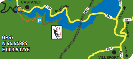 «Altier» puis suivre la signalétique via ferrata . La petite route longe la rive droite du lac pour atteindre le parking situé dans une épingle, à 5 mn du village de Castanet.
